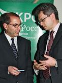 Председатель правления Альфа-банка Рушан Хвесюк (слева) и президент Ассоциации Банков Центральной России Гарегин Тосунян (справа) перед началом церемонии вручения премии журнала "Итоги" "День Банкира 2008" в гостинице "Балчуг Кемпински".