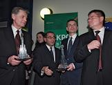 Слева направо: член комитета Государственной думы России по финансовому рынку Павел Медведев, президент финансовой корпорации "УРАЛСИБ" Николай Цветков и первый заместитель председателя Центрального Банка России Алексей Улюкаев во время церемонии вручения премии журнала "Итоги" "День Банкира 2008" в гостинице "Балчуг Кемпински".