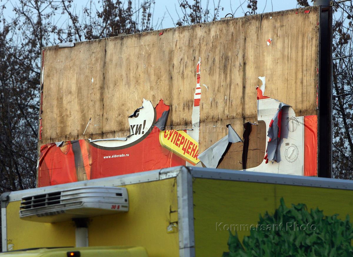 Жанровая фотография. Рекламный щит с оборванным плакатом.