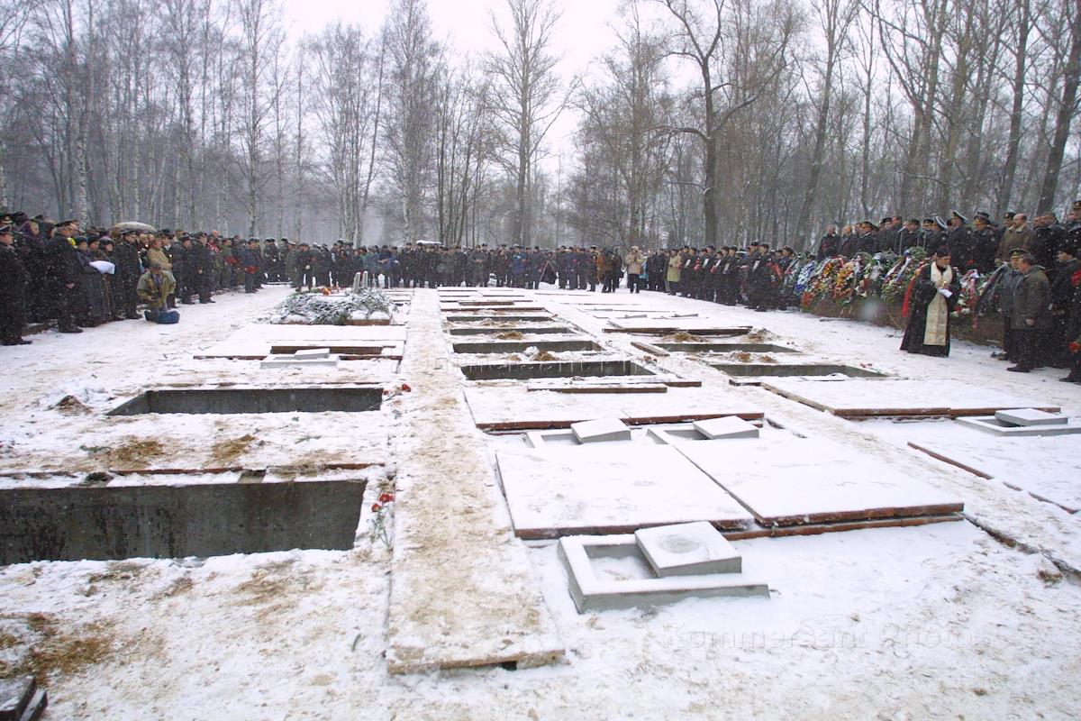 Похороны экипажа атомной подводной лодки "Курск" на Серафимовском кладбище. Родственники прощаются с погибшими моряками. Идет отпевание погибших.
