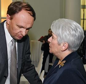 Руководитель Федерального агентства по печати и массовым коммуникациям (ФАПМК) России Михаил Сеславинский (слева) и вдова писателя Александра Солженицына Наталья (справа) перед началом церемонии вручения литературной премии "Большая книга" 2008 года. Награждение прошло в Доме Пашкова (Российская государственная библиотека).