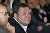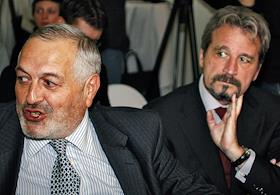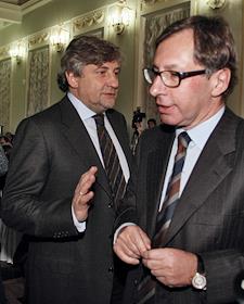 Вице-президент компании "Крос" Виталий Дымарский (слева) и первый заместитель председателя Совета директоров "Альфа-Банка" Олег Сысуев (справа) на церемонии вручения литературной премии "Большая книга" 2008 года. Награждение прошло в Доме Пашкова (Российская государственная библиотека).