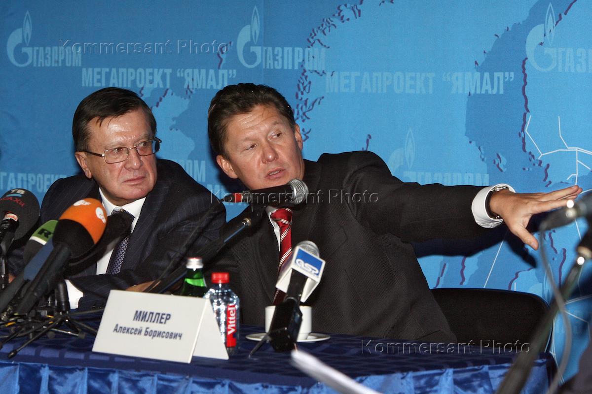 Первый заместитель председателя правительства России Виктор Зубков (слева) и глава РАО "Газпром" Алексей Миллер (справа) на заседании, посвященному сварке первого стыка газопровода "Бованенково-Ухта" в рамках реализации проекта "Ямал".