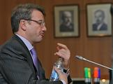 Президент, председатель правления Сбербанка России Герман Греф во время пресс-конференции на тему: "Стратегии развития Сбербанка до 2014 года". Пресс-конференция прошла в главном офисе Сбербанка России.