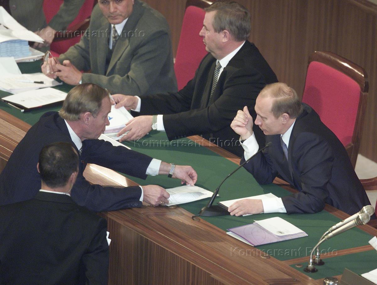 Председатель Государственной Думы России Геннадий Селезнев (справа), Президент России Владимир Путин (в центре) и председатель Московской Хельсинской группы Людмила Алексеева на открытии Гражданского форума общественных объединений и союзов России в Государственном Кремлевском Дворце.