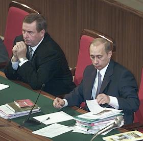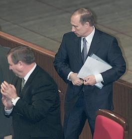 Председатель Государственной Думы Геннадий Селезнев (слева) и Президент России Владимир Путин (справа) и на открытии Гражданского форума общественных объединений и союзов России в Государственном Кремлевском Дворце.