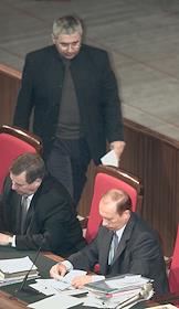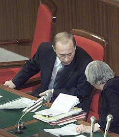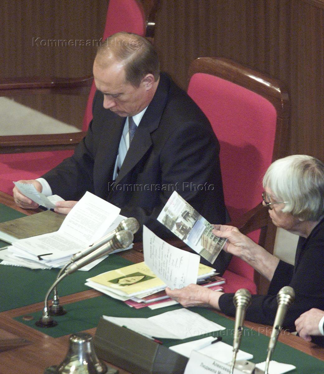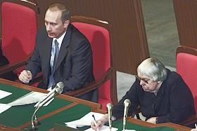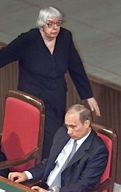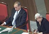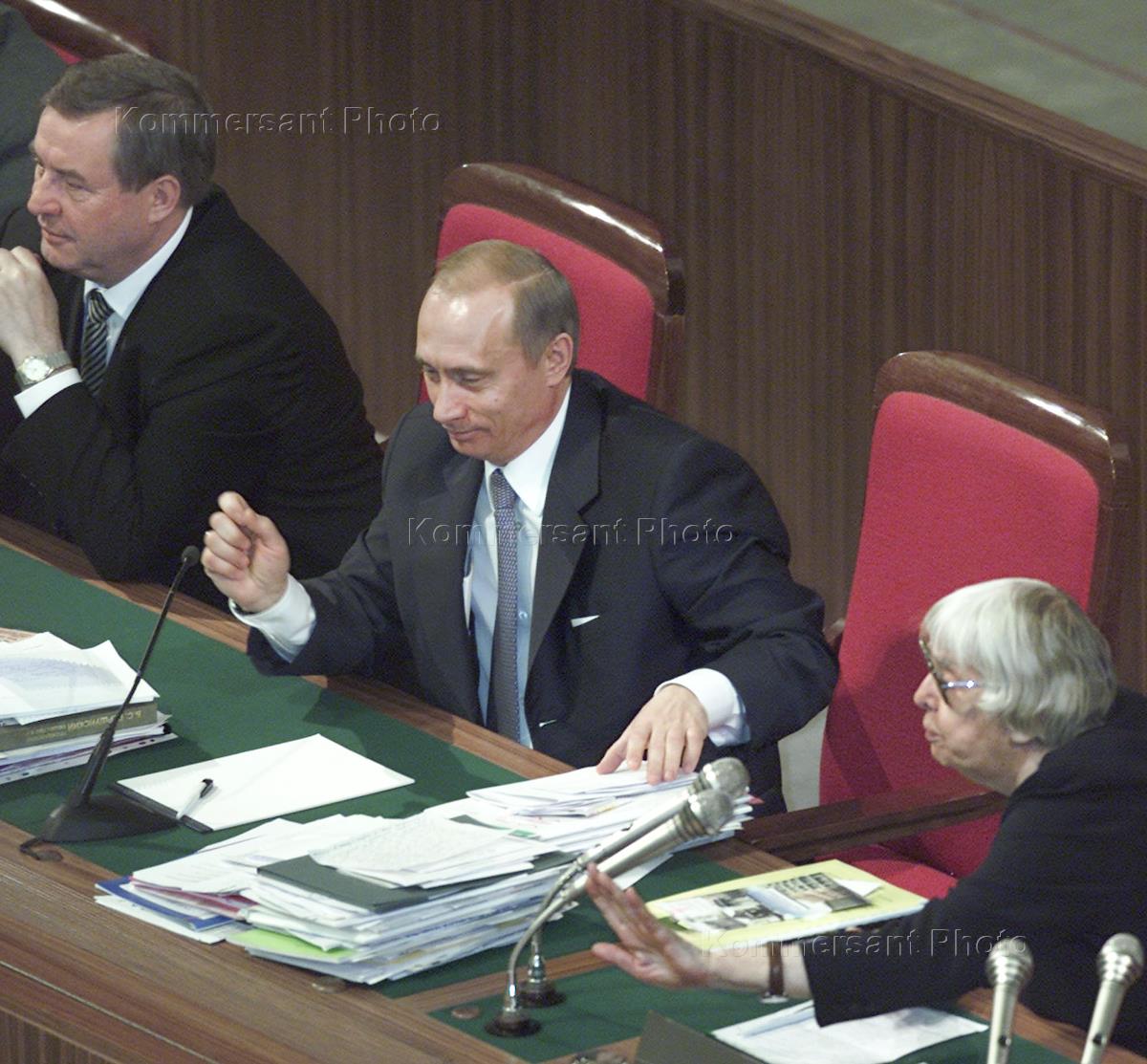 Председатель Государственной Думы России Геннадий Селезнев (справа), Президент России Владимир Путин (в центре) и председатель Московской Хельсинской группы Людмила Алексеева на открытии Гражданского форума общественных объединений и союзов России в Государственном Кремлевском Дворце.
