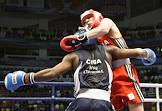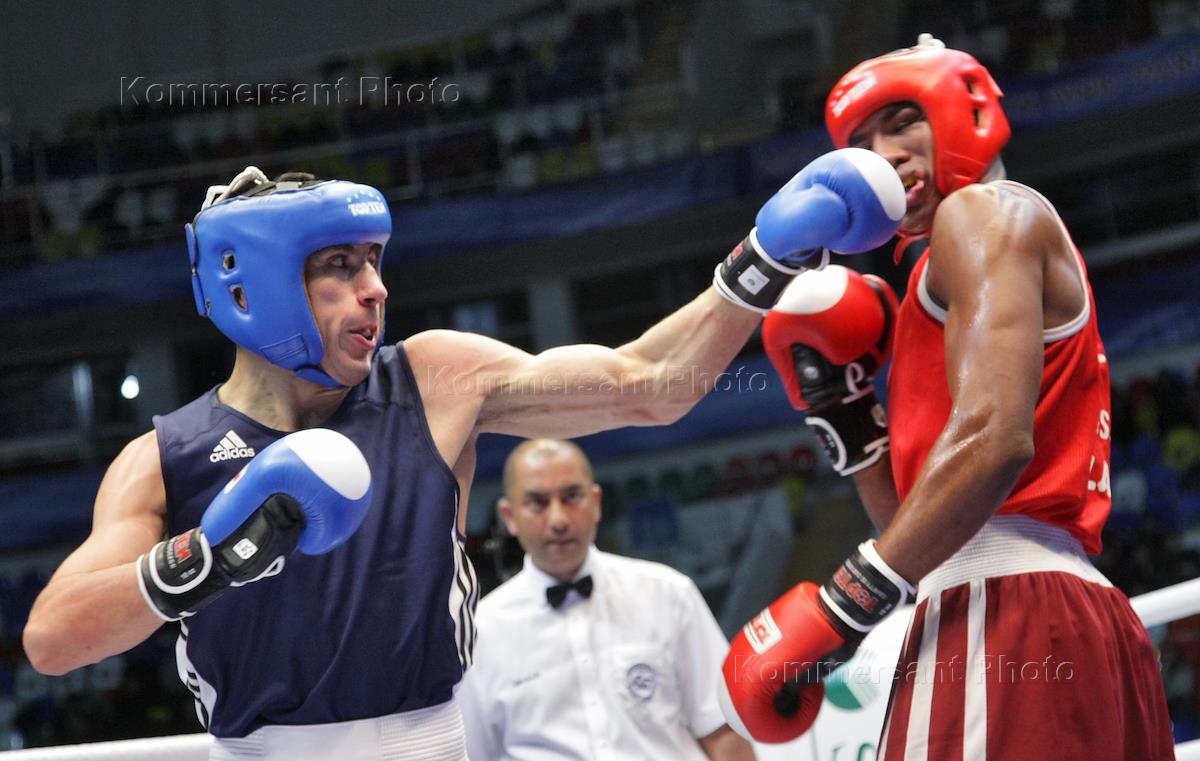 Кубок мира по боксу 2008 по версии Международной ассоциации любительского бокса (AIBA). Кубинский боксер Идел Торриенто (слева) и российский боксер Сергей Игнатьев (справа) во время боя во Дворце спорта "Мегаспорт".