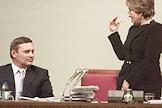 Председатель Правительства России Михаил Касьянов (слева) и его заместитель по социальным вопросам Валентина Матвиенко (справа) в президиуме "Гражданского форума", который состоялся в Государственном Кремлевском Дворце.