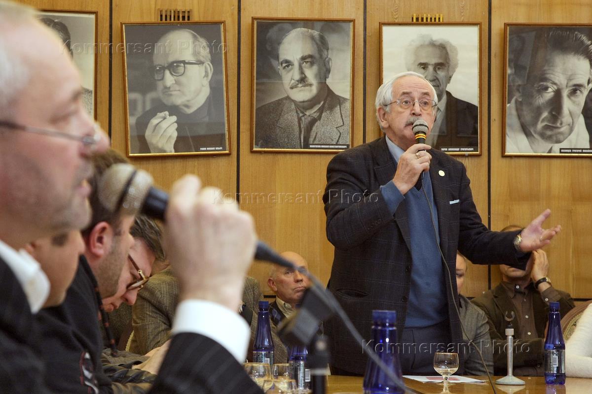 Депутат Московской городской Думы, кинорежиссер Евгений Герасимов (слева) и актер Василий Ливанов (справа) во время выступления на пленуме Союза кинематографистов в Доме Кино.