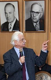 Президент Гильдии киноведов и кинокритиков Союза кинематографистов России Виктор Матизен (второй слева) и кинорежиссёр Марлен Хуциев (в центре) на пленуме Союза кинематографистов в Доме Кино.