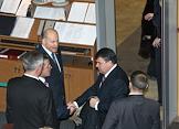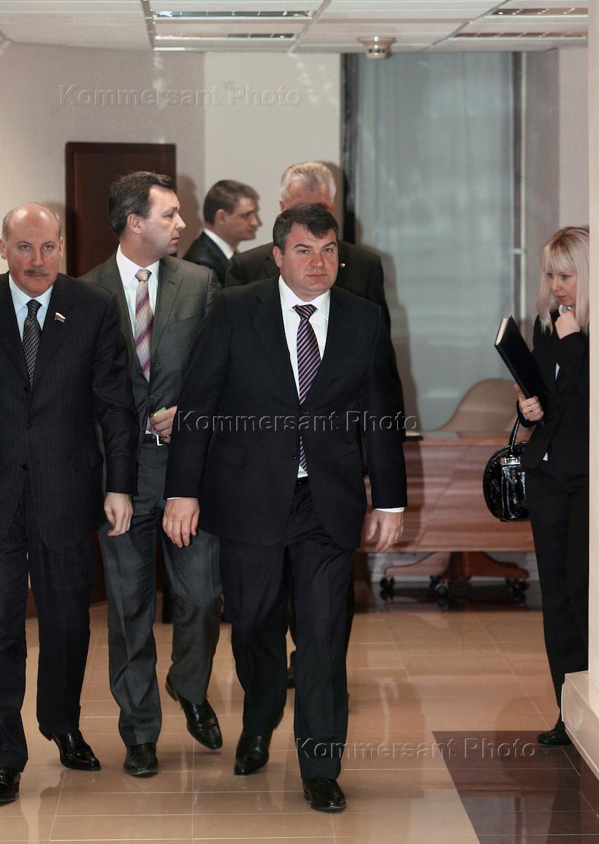 Заместитель председателя Совета Федерации России Дмитрий Мезенцев (слева) и министр обороны России Анатолий Сердюков (справа) перед началом пленарного заседания Совета Федерации.
