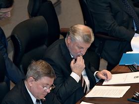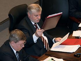 Председатель Совета Федерации (СФ) России Сергей Миронов (справа) и его заместитель Александр Торшин (слева) во время пленарного заседания СФ.