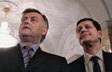 Президент ОАО "Российские железные дороги" (РЖД) Владимир Якунин (слева) и заместитель председателя правительства России Александр Жуков (справа) перед началом заседания Совета директоров ОАО "Российские железные дороги" (РЖД). Заседание прошло в офисе РЖД.
