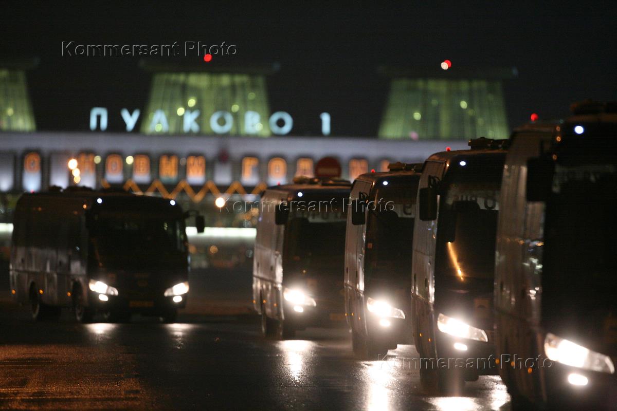 Колонна автобусов с телами погибших в автокатастрофе в Израиле в аэропорту Пулково.