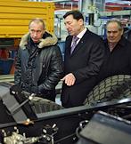 Главный конструктор ОАО "КАМАЗ", Директор Научно-технического центра ОАО "КАМАЗ" Данис Валеев (слева) и председатель правительства России Владимир Путин (второй слева) во время посещения автомобильного завода "КАМАЗ".