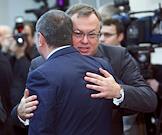 Президент Республики Татарстан Минтимер Шаймиев (слева) и министр промышленности и торговли России Виктор Христенко (справа) во время совещания по вопросу "О дополнительных мерах по стабилизации и оздоровлению ситуации в российской автомобильной промышленности".