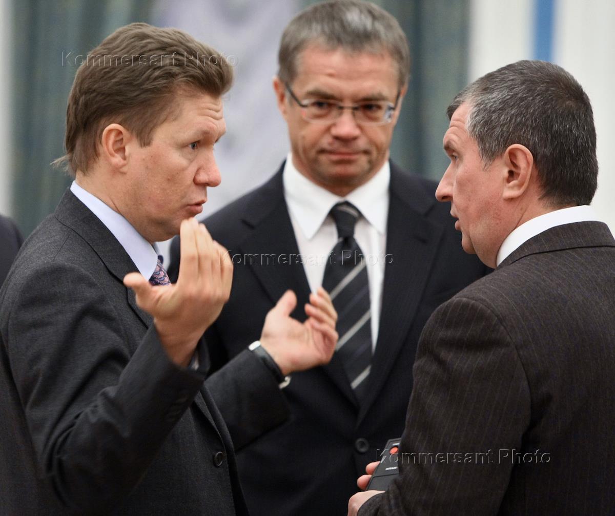 Слева направо: заместитель председателя правительства России Игорь Сечин, председатель правления ОАО "Газпром" Алексей Миллер и генеральный директор ООО "Газпром экспорт" Александр Медведев перед началом церемонии подписания совместных российско-сербских документов. Церемония прошла в Кремле.