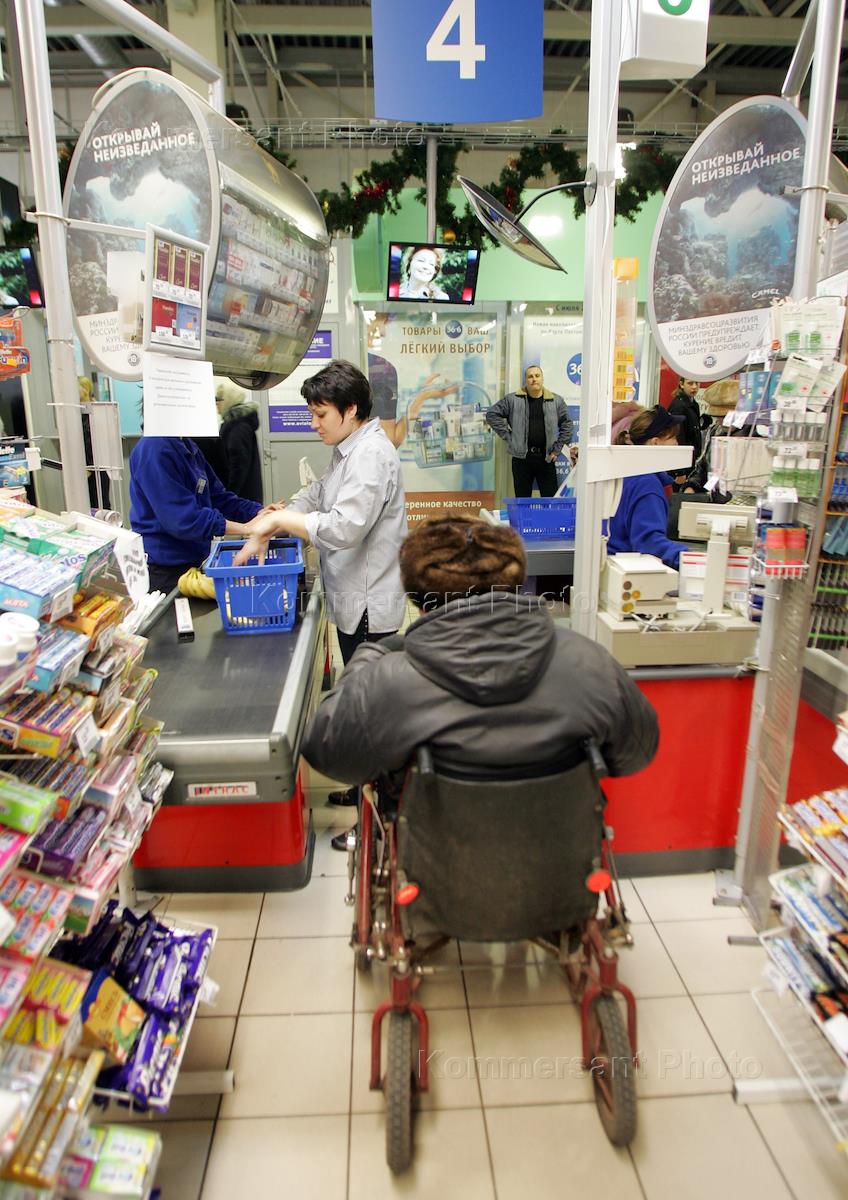 Жанровая фотография. Инвалид в коляске в кассовом отделе супермаркета "Перекресток".