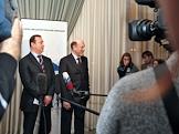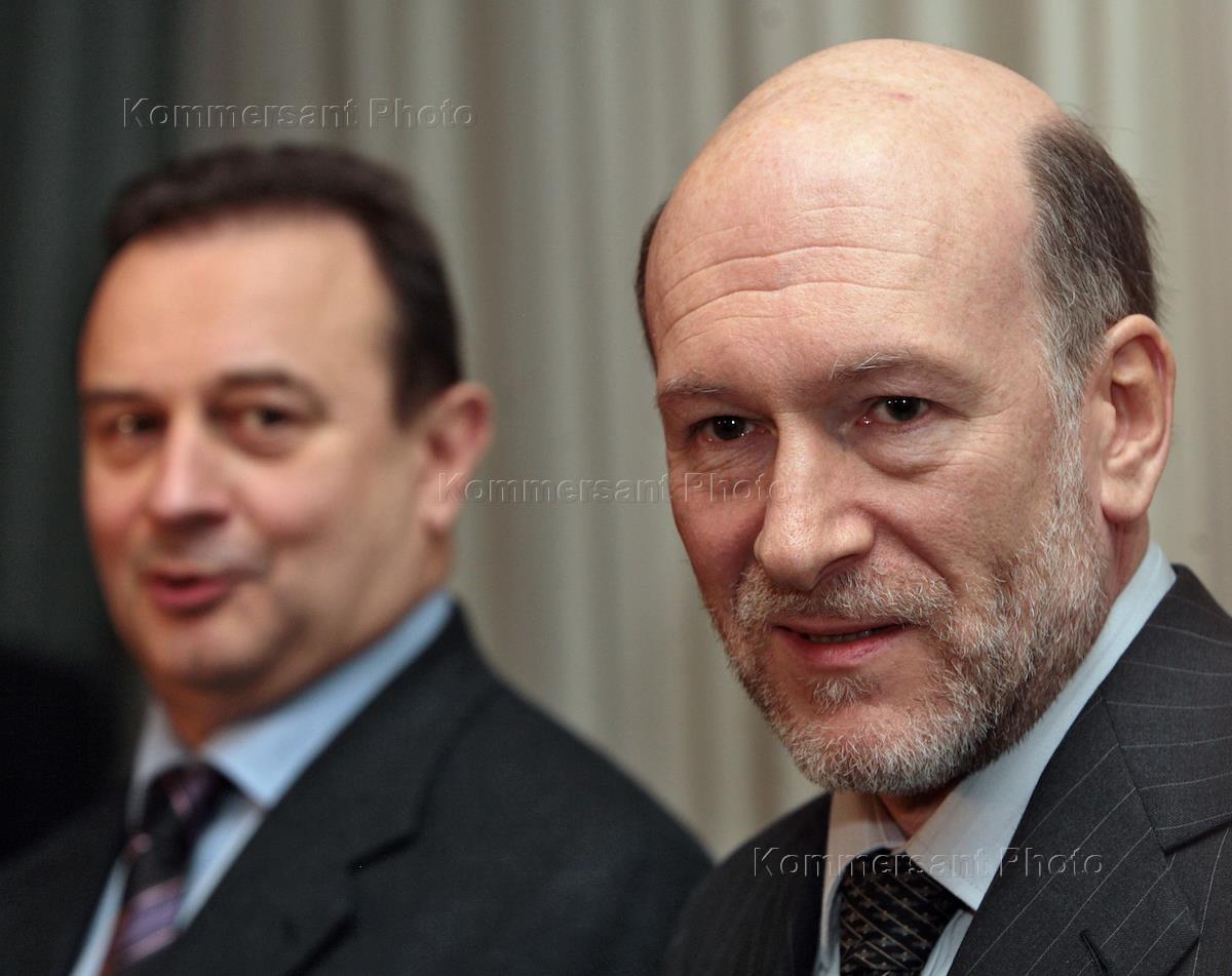 Генеральный директор – председатель правления ОАО "ГМК "Норильский никель" Владимир Стржалковский (слева) и новый председатель совета директоров ОАО "ГМК "Норильский никель" Александр Волошин (справа) во время объявления нового состава совета директоров "Норникеля". Объявление состоялось в "Президент-отеле".