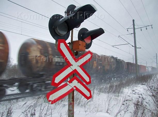 Цистерны товарного состава и светофор с предупреждающим дорожным знаком "Многопутная железная дорога" на железнодорожном переезде.