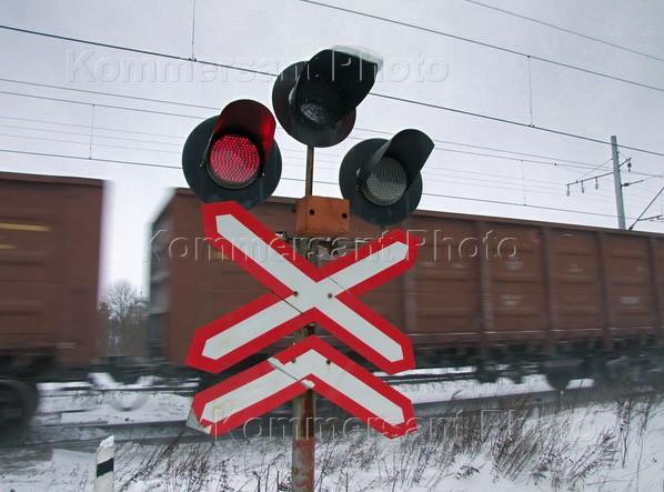 Вагоны товарного состава и светофор с предупреждающим дорожным знаком "Многопутная железная дорога" на железнодорожном переезде.