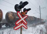 Цистерны товарного состава и светофор с предупреждающим дорожным знаком "Многопутная железная дорога" на железнодорожном переезде.