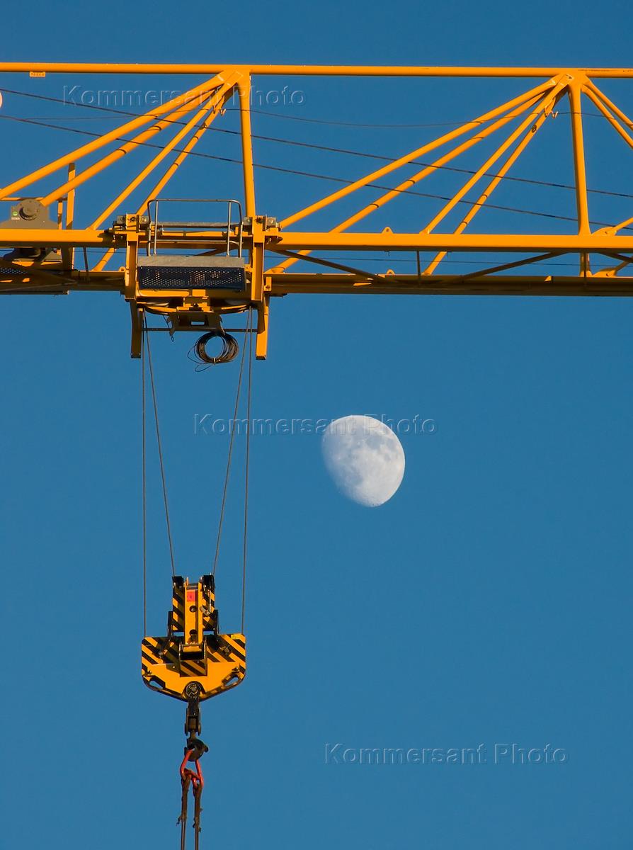 Жанровая фотография. Стрела подъемного башенного крана на строительстве высотного здания.