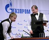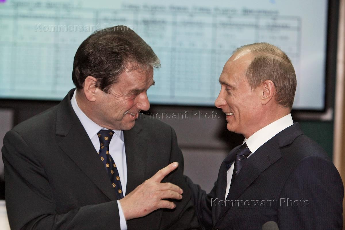 Председатель правления Ассоциации европейского бизнеса в России, глава представительства в России "E.ON Ruhgas Ag" Рейнер Хартман (слева) и председатель правительства России Владимир Путин (справа) во время официальной встречи в здании "Газпрома".