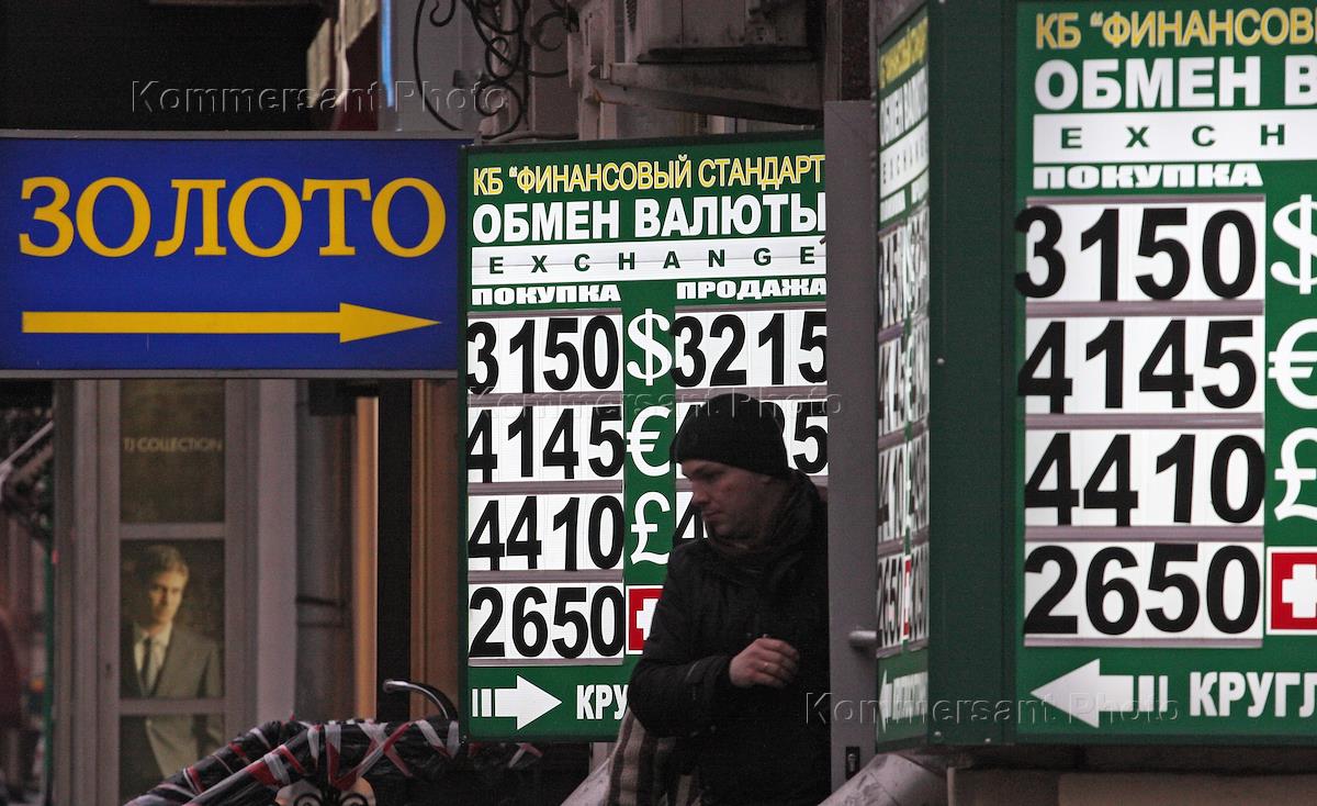 A cross street banner "crisis conclude" against Moscow bank office.