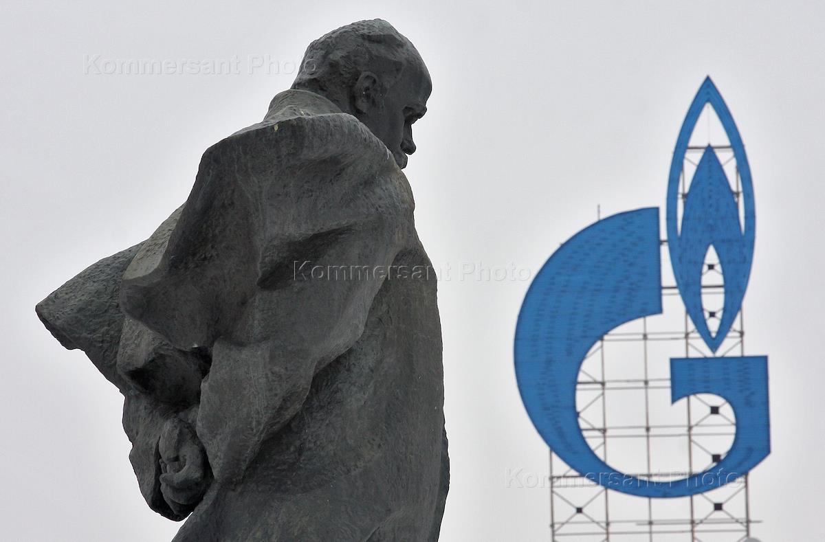 Monument to writer Taras Shevchenko and company "Gazprom" advertising on an apartment house roof.
