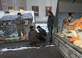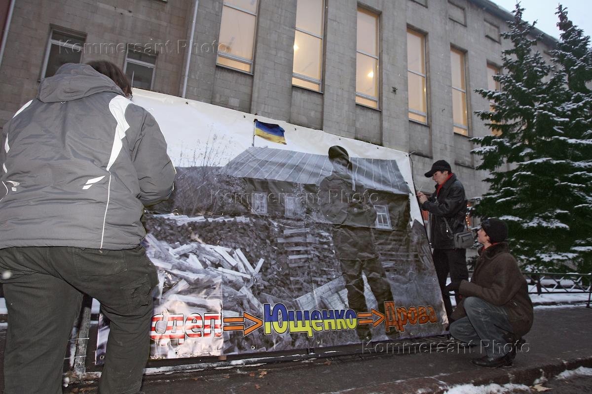 Участники акции молодежного движения "Наши" у здания посольства Украины. Активисты движения принесли к дипмиссии несколько вязанок оранжевых дров с предложением украинскому президенту Виктору Ющенко отапливать этими дровами, вместо российского газа, здание своей администрации.
