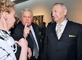 Председатель Комитета Государственной Думы по делам национальностей Валентин Купцов (в центре) и представитель в Совете Федерации России от органов исполнительной власти Республики Северная Осетия - Алания Александр Дзасохов (справа) на церемонии открытия ретроспективной выставки вице-президента Российской академии художеств Таира Салахова, приуроченной к его 80-летнему юбилею. Выставка открылась в фонде культуры "Екатерина".