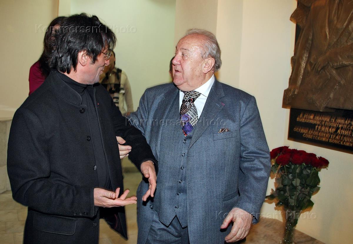 Чрезвычайный и полномочный Посол Азербайджана в России, композитор Полад Бюльбюль оглы (слева) и специальный представитель президента по международному культурному сотрудничеству Михаил Швыдкой (справа) на ужине в честь открытия выставки вице-президента Российской академии художеств Таира Салахова, приуроченной к его 80-летнему юбилею. Ужин прошел в посольстве Азербайджана.