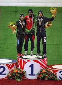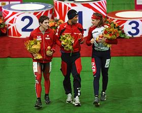 Чемпионат мира по конькобежному спорту. Победители заключительного забега на 1000 метров слева направо: канадский спортсмен Денни Моррисон (серебро), американский спортсмен Шэйни Дэвис (золото) и российский спортсмен Евгений Лаленков (бронза) во время награждения. Соревнования прошли в спортивном комплексе (СК) "Крылатское".