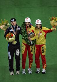 Чемпионат мира по конькобежному спорту. Победители в спринтерском многоборье китайская спортсменка Ван Бэйсин (слева) и американский спортсмен Шэйни Дэвис (в центре) после церемонии награждения. Соревнования прошли в спортивном комплексе (СК) "Крылатское".