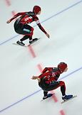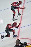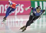 Чемпионат мира по конькобежному спорту. Конькобежец из Нидерландов Симон Куйперс (слева) и корейский конькобежец Кью-Хьюк Ли (справа) во время соревнований на спринтерских дистанциях. Соревнования прошли в спортивном комплексе (СК) "Крылатское".