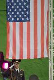 Чемпионат мира по конькобежному спорту. Церемония поднятия государственного флага США во время награждения. Соревнования прошли в спортивном комплексе (СК) "Крылатское".