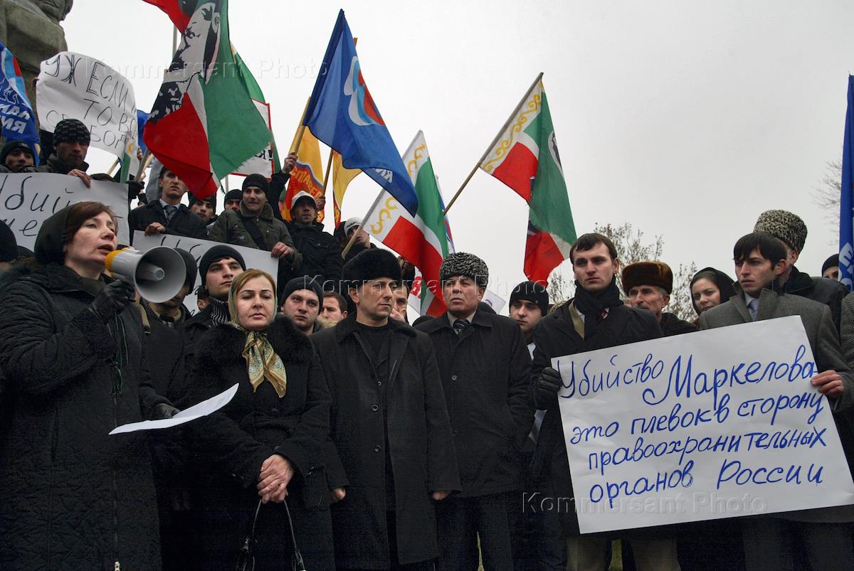 Митинг протеста против убийства адвоката Станислава Маркелова и журналистки Анастасии Бабуровой. Участники акции держат плакат "Убийство Маркелова - это плевок в сторону правоохранительных органов России".