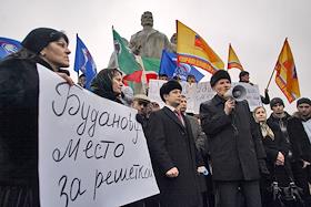 Митинг протеста против убийства адвоката Станислава Маркелова и журналистки Анастасии Бабуровой. Участники акции держат плакат "Буданову место за решеткой".