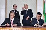 Слева направо: министр иностранных дел России Сергей Лавров, президент России Дмитрий Медведев, президент Узбекистана Ислам Каримов во время подписания документов по итогам переговоров.