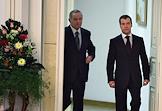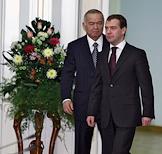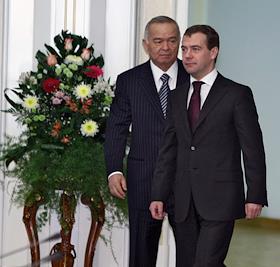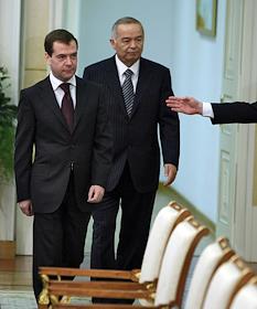 Президент России Дмитрий Медведев (слева) и президент Узбекистана Ислам Каримов (справа) во время встречи.