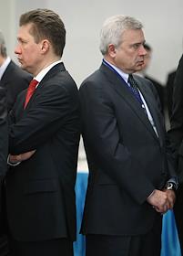 Глава РАО "Газпром" Алексей Миллер (слева) и президент нефтяной компании "ЛУКойл" Вагит Алекперов (справа) на официальной встрече президентов России и Узбекистана.