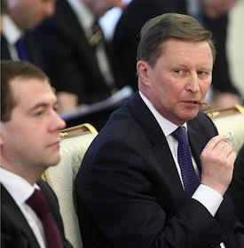 Президент России Дмитрий Медведев (слева) и заместитель председателя правительства России Сергей Иванов (справа) во время переговоров с президентом Узбекистана Исламом Каримовым.
