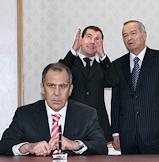 Министр иностранных дел России Сергей Лавров (слева) и заместитель председателя правительства России Сергей Иванов (справа) во время подписания документов по итогам переговоров с президентом Узбекистана Исламом Каримовым.