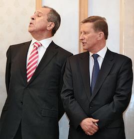 Министр транспорта России Игорь Левитин (слева) и министр иностранных дел России Сергей Лавров (справа) во время подписания документов по итогам переговоров с президентом Узбекистана Исламом Каримовым.