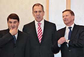 Слева направо: министр транспорта России Игорь Левитин, министр иностранных дел России Сергей Лавров и заместитель председателя правительства России Сергей Иванов во время подписания документов по итогам переговоров с президентом Узбекистана Исламом Каримовым.