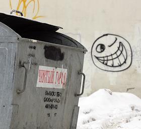 Жанровая фотография. Мусорный бак с надписью "Чистый город" и смайлик, нарисованный на стене дома.