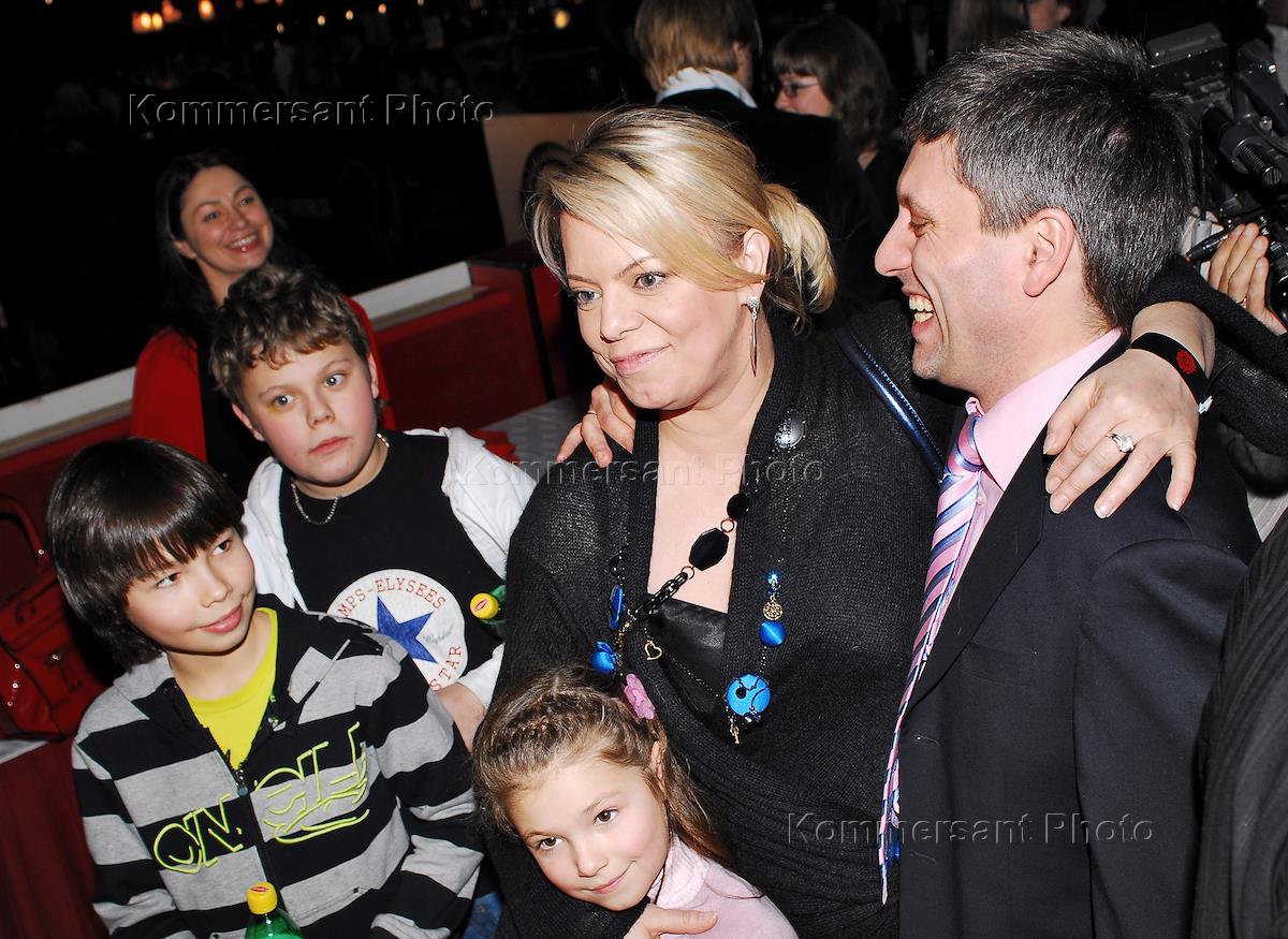 Singer Natasha Koroleva with her son during the gala show devoted to the 100-th performance of the Russian staging of the musical "Beauty and the Beast" in the Moscow youth theatre.