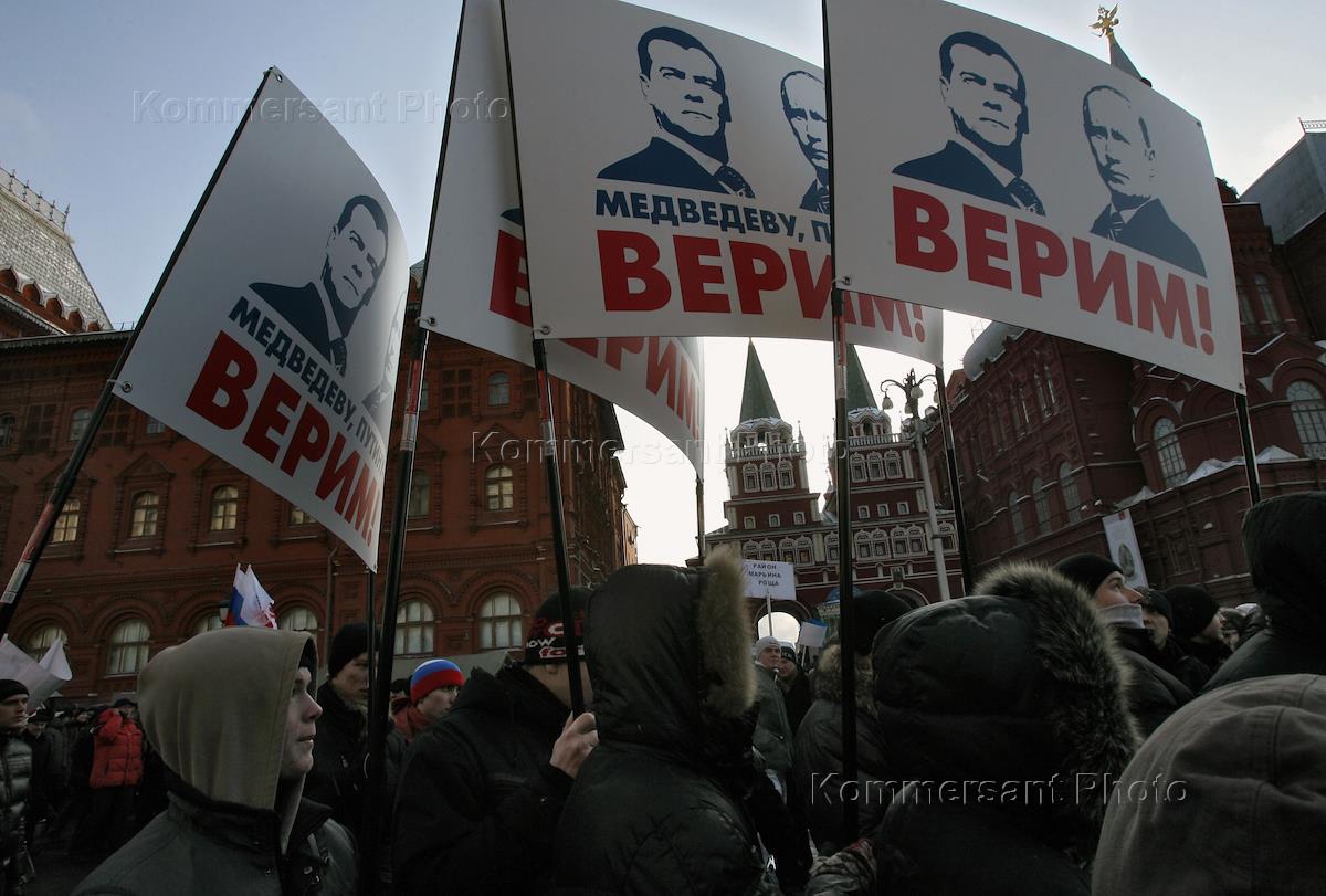 Всероссийская акция, организованная партией "Единая Россия", в поддержку антикризисных мер, принимаемых правительством и президентом, прошла на Манежной площади. Плакаты "Медведеву, Путину верим!".